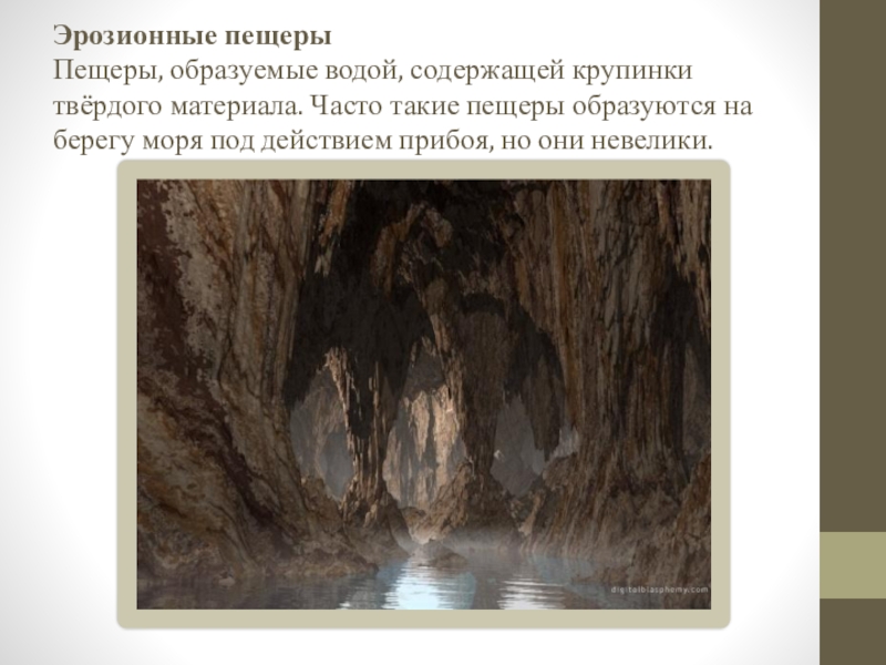 Пещеры, образуемые водой, содержащей крупинки твёрдого материала. Часто такие пещеры