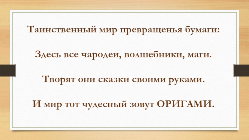 Таинственный мир превращенья бумаги:Здесь все чародеи, волшебники, маги. Творят они сказки своими руками.И мир тот чудесный зовут