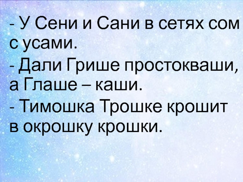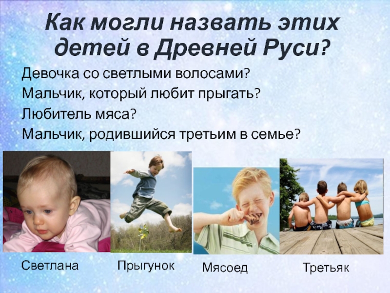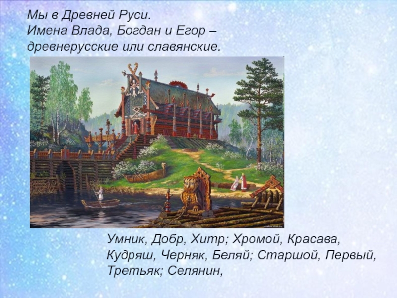 Умник, Добр, Хитр; Хромой, Красава, Кудряш, Черняк, Беляй; Старшой, Первый, Третьяк; Селянин,