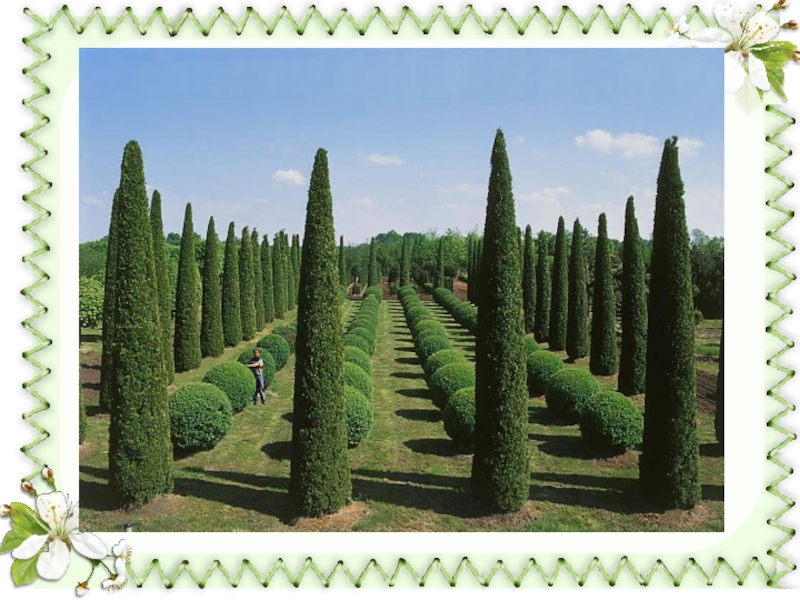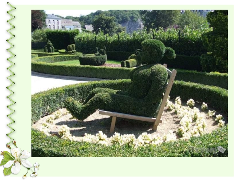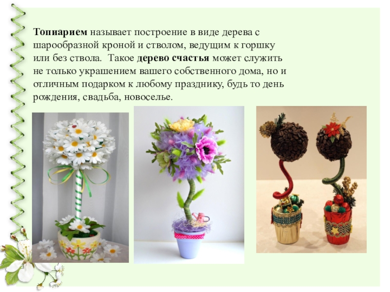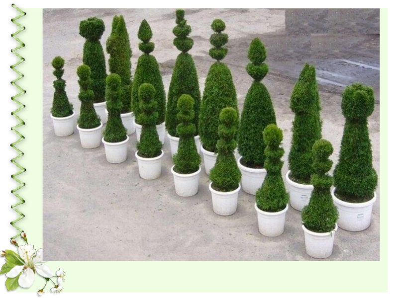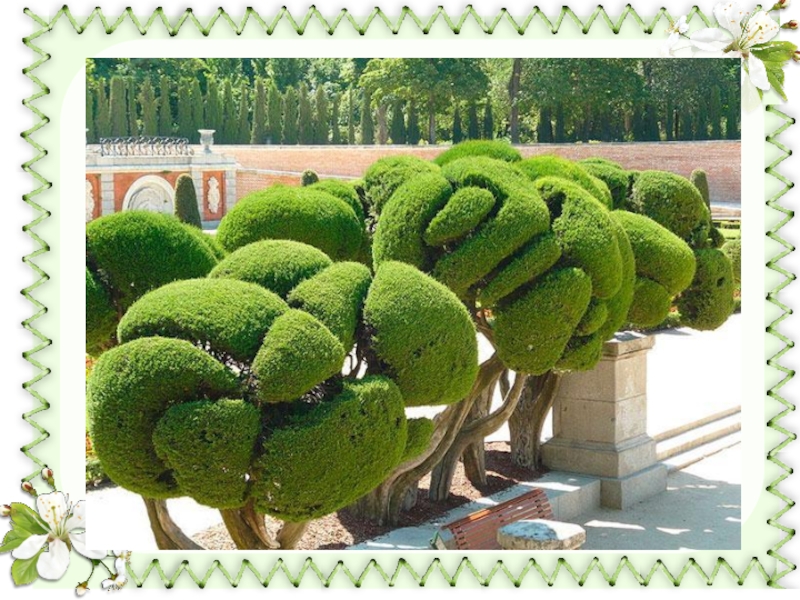 Слайд 4Топиарием называет построение в виде дерева с шарообразной кроной и стволом, ведущим