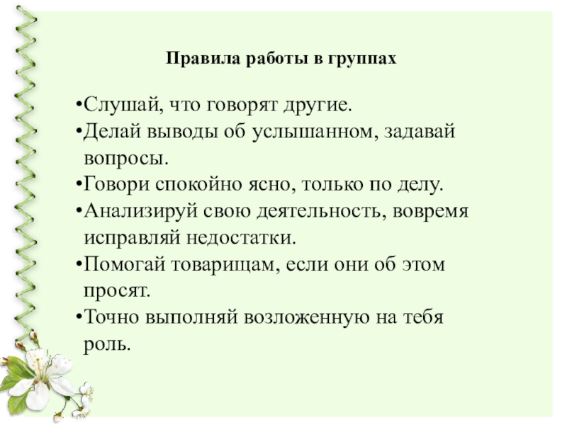 Правила работы в группахСлушай, что говорят другие.Делай выводы об услышанном, задавай вопросы.Говори спокойно ясно, только по делу.Анализируй
