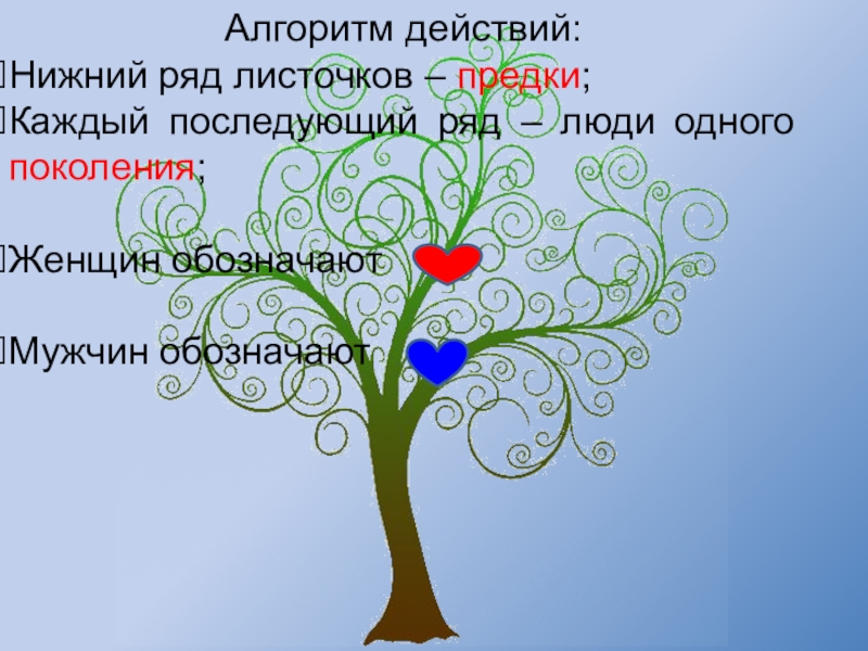 Алгоритм действий:Нижний ряд листочков – предки;Каждый последующий ряд – люди одного поколения;Женщин обозначают Мужчин обозначают