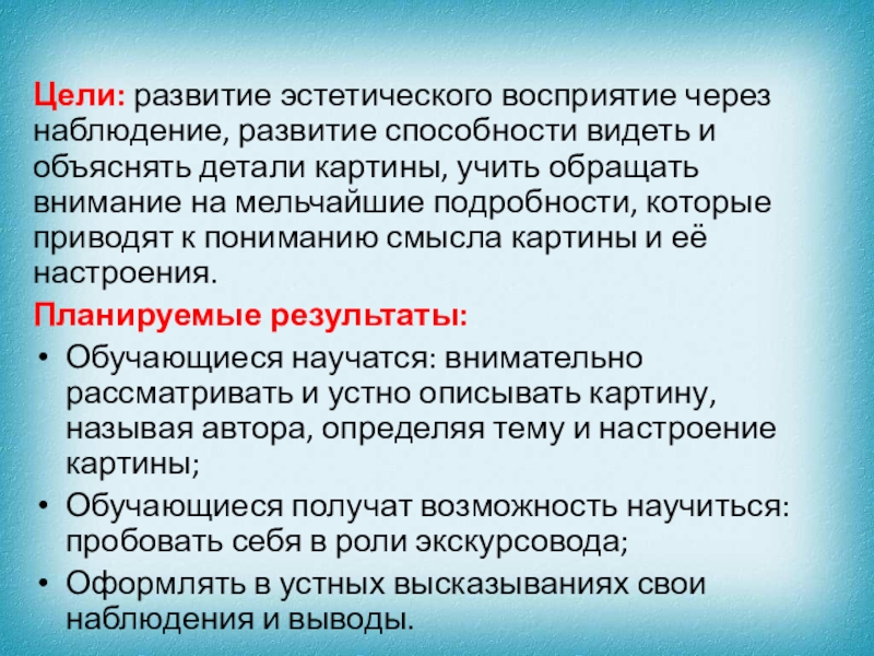 Обучающиеся научатся: внимательно рассматривать и устно описывать картину, называя автора, определяя тему и настроение картины;