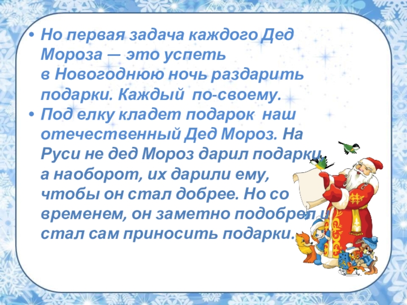 Слайд 6Но первая задача каждого Дед Мороза — это успеть в Новогоднюю ночь раздарить подарки.