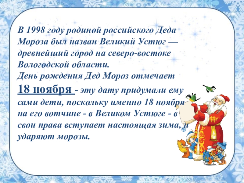 Слайд 10В 1998 году родиной российского Деда Мороза был назван Великий Устюг