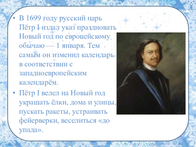 Слайд 3В 1699 году русский царь Пётр I издал указ праздновать Новый