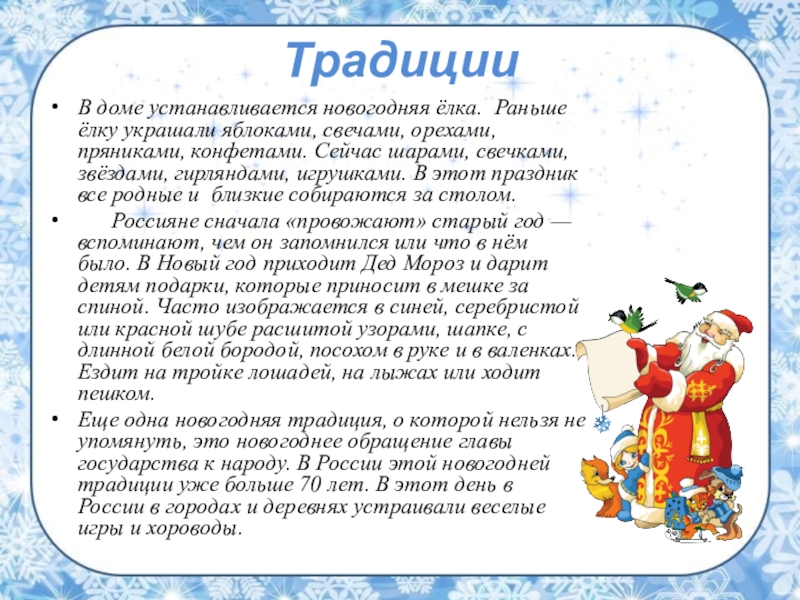 Еще одна новогодняя традиция, о которой нельзя не упомянуть, это новогоднее обращение главы государства к народу. В России этой новогодней традиции уже больше 70 лет. В этот день в России в городах и деревнях устраивали веселые игры и хороводы.
