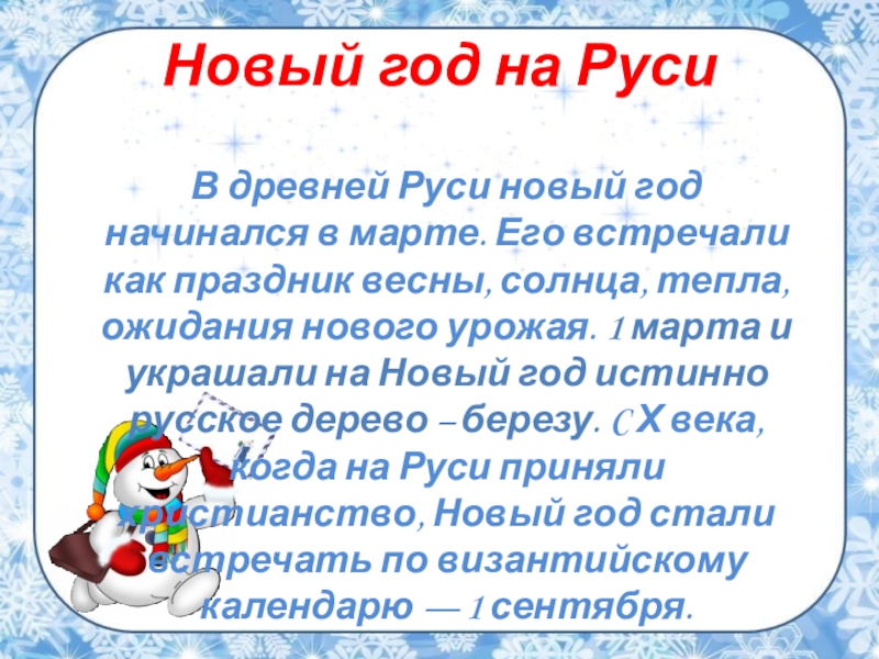 Его встречали как праздник весны, солнца, тепла, ожидания нового урожая. 1 марта и украшали на Новый год истинно русское дерево – березу. C Х века, когда на Руси приняли христианство, Новый год стали встречать по византийскому календарю — 1 сентября.