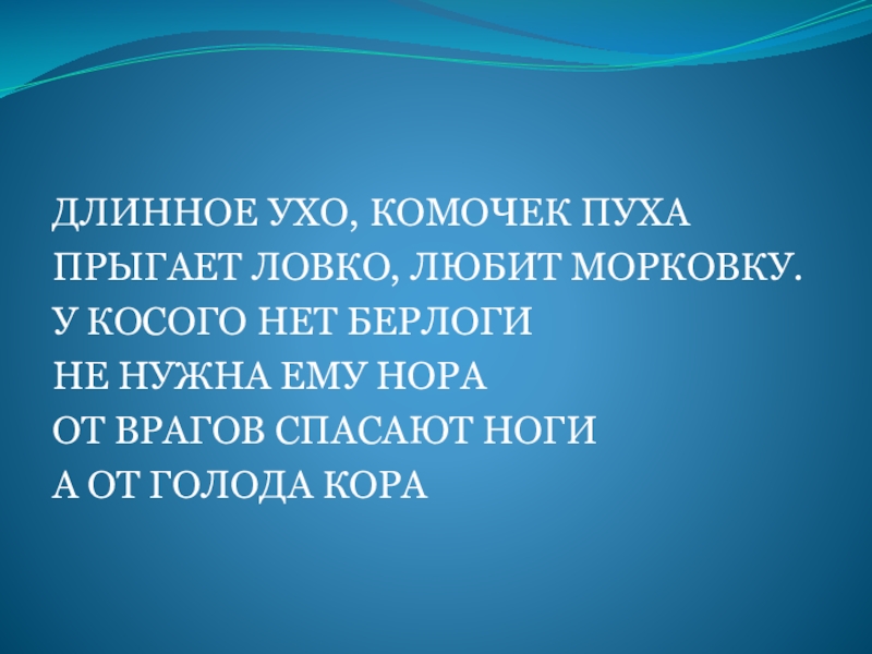 ДЛИННОЕ УХО, КОМОЧЕК ПУХАПРЫГАЕТ ЛОВКО, ЛЮБИТ МОРКОВКУ.У КОСОГО НЕТ БЕРЛОГИНЕ НУЖНА ЕМУ НОРАОТ ВРАГОВ СПАСАЮТ НОГИА ОТ