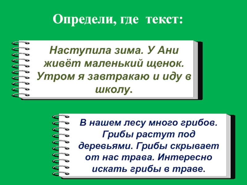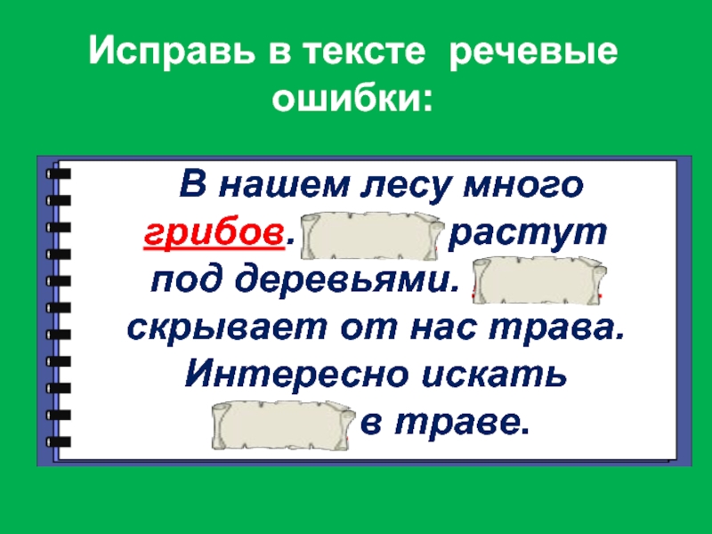 В нашем лесу много грибов. Грибы растут под деревьями. Грибы скрывает от нас трава. Интересно искать грибы в траве.