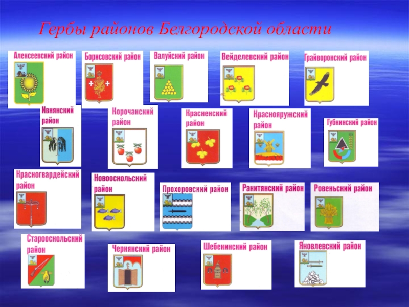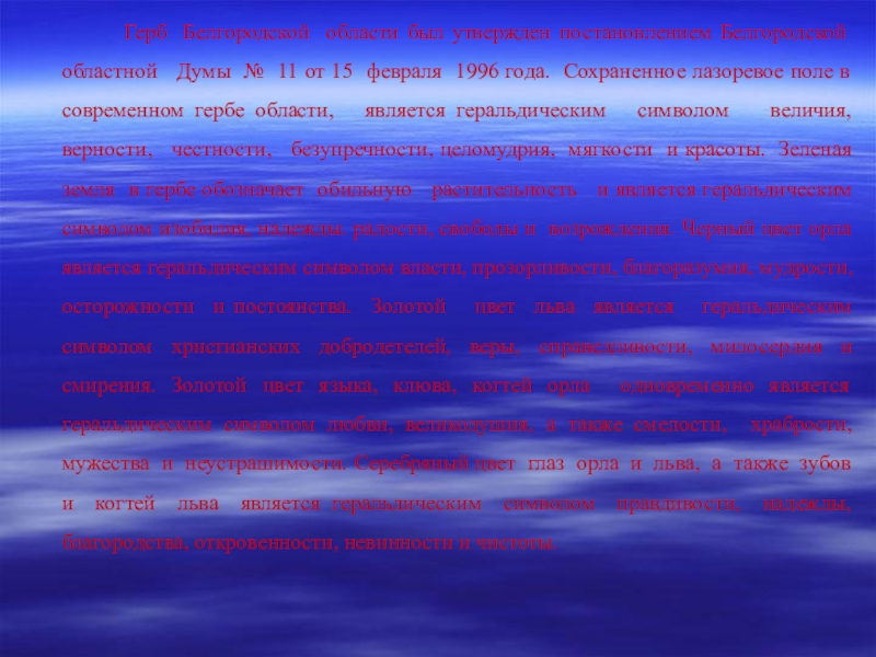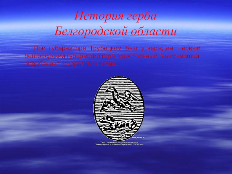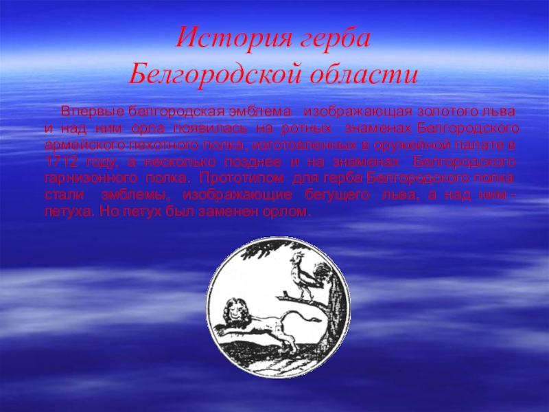 Герб Белгородской области в своей основе максимально сохраняет историческую и геральдическую преемственность первых белгородских гербов, разработанных в 1712 и 1729 - 1730 годах. Размещение на геральдическом щите герба золотого льва и над ним одноглавого орла связано с конкретным историческим событием: достойным участием белгородцев в составе Белгородского армейского полевого полка в Северной войне 1700 - 1721 годов