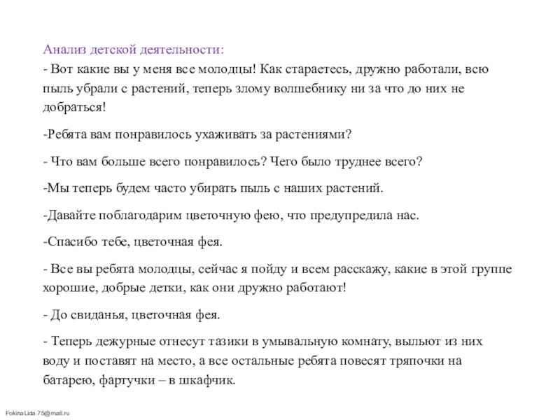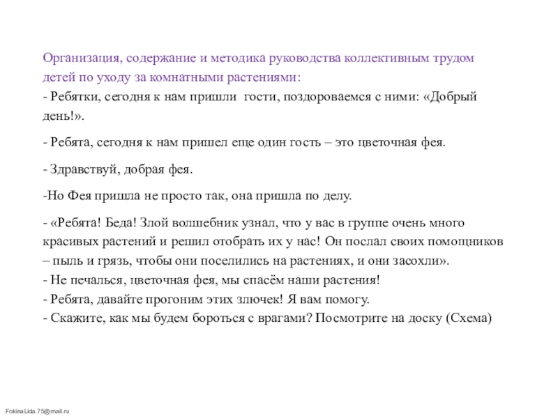 - «Ребята! Беда! Злой волшебник узнал, что у вас в группе очень много красивых растений и решил отобрать их у нас! Он послал своих помощников – пыль и грязь, чтобы они поселились на растениях, и они засохли».