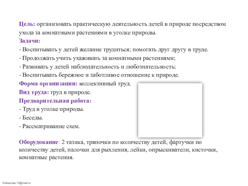 Слайд 2Цель: организовать практическую деятельность детей в природе посредством ухода за комнатными