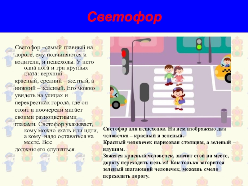 Зажегся красный человечек, значит стой на месте, дорогу переходить нельзя! Как только загорится зеленый шагающий человечек, можешь смело переходить дорогу.