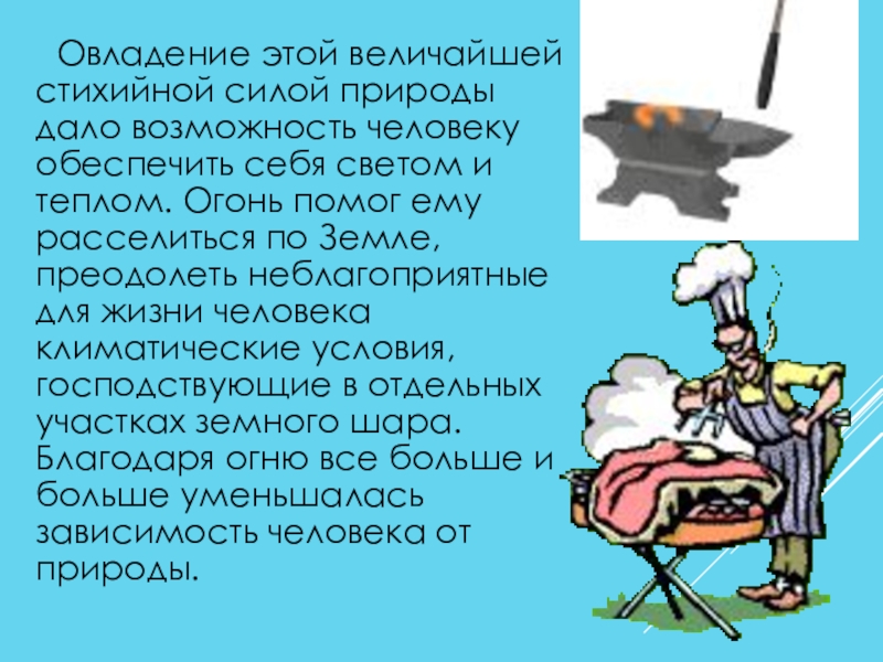 человеку обеспечить себя светом и теплом. Огонь помог ему расселиться по Земле, преодолеть неблагоприятные для жизни человека климатические условия, господствующие в отдельных участках земного шара. Благодаря огню все больше и больше уменьшалась зависимость человека от природы.