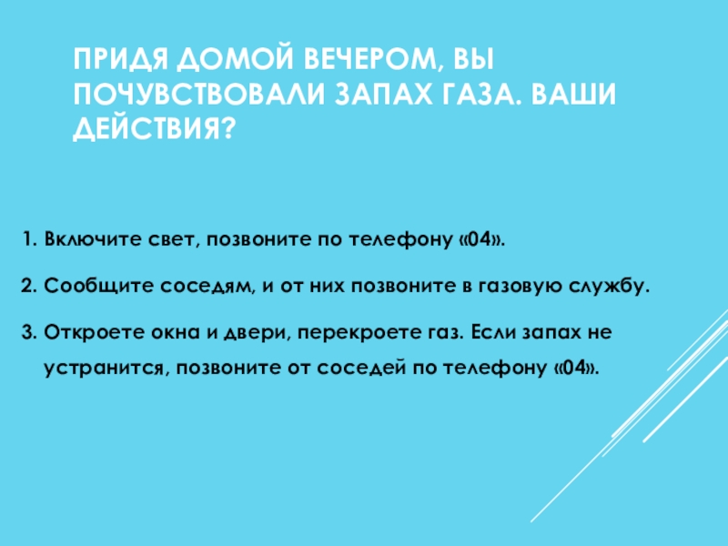Слайд 31ПРИДЯ ДОМОЙ ВЕЧЕРОМ, ВЫ ПОЧУВСТВОВАЛИ ЗАПАХ ГАЗА. ВАШИ ДЕЙСТВИЯ?