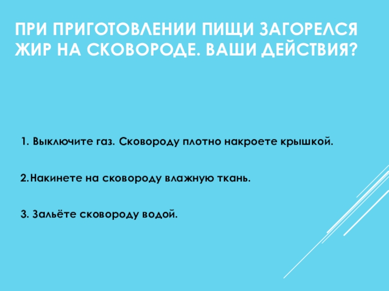 Слайд 32ПРИ ПРИГОТОВЛЕНИИ ПИЩИ ЗАГОРЕЛСЯ ЖИР НА СКОВОРОДЕ. ВАШИ ДЕЙСТВИЯ?