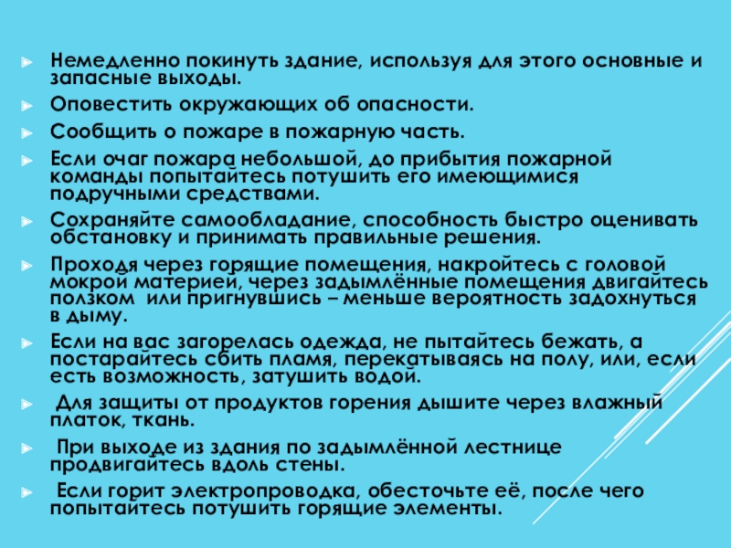 Слайд 29Немедленно покинуть здание, используя для этого основные и запасные выходы.