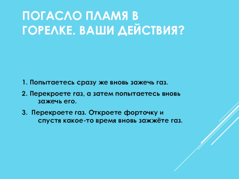 Слайд 33ПОГАСЛО ПЛАМЯ В ГОРЕЛКЕ. ВАШИ ДЕЙСТВИЯ?