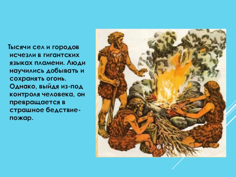 Люди научились добывать и сохранять огонь. Однако, выйдя из-под контроля человека, он превращается в страшное бедствие-пожар.