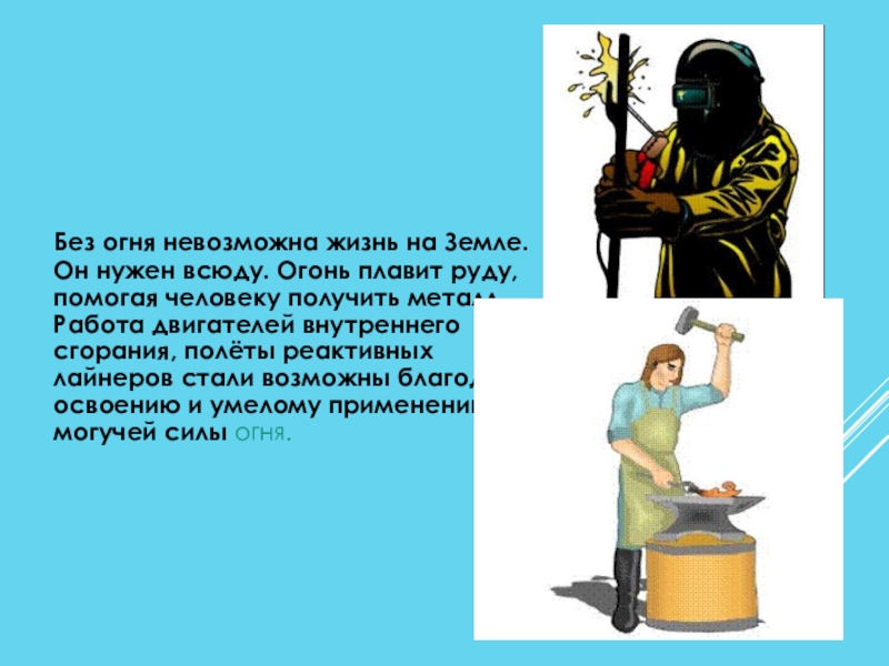 Огонь плавит руду, помогая человеку получить металл. Работа двигателей внутреннего сгорания, полёты реактивных лайнеров стали возможны благодаря освоению и умелому применению могучей силы огня.