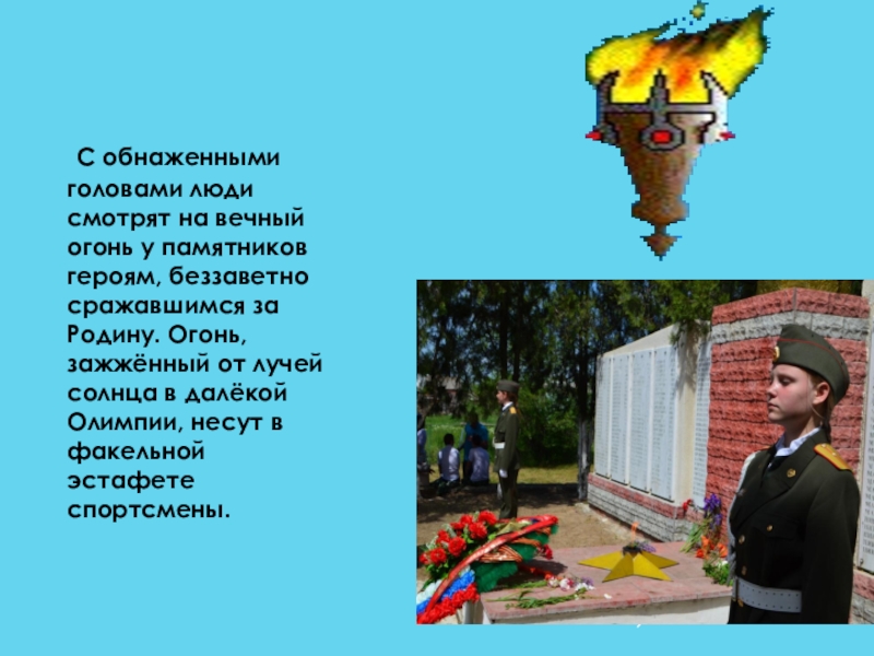 памятников героям, беззаветно сражавшимся за Родину. Огонь, зажжённый от лучей солнца в далёкой Олимпии, несут в факельной эстафете спортсмены.