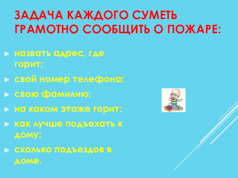 Слайд 26ЗАДАЧА КАЖДОГО СУМЕТЬ ГРАМОТНО СООБЩИТЬ О ПОЖАРЕ: