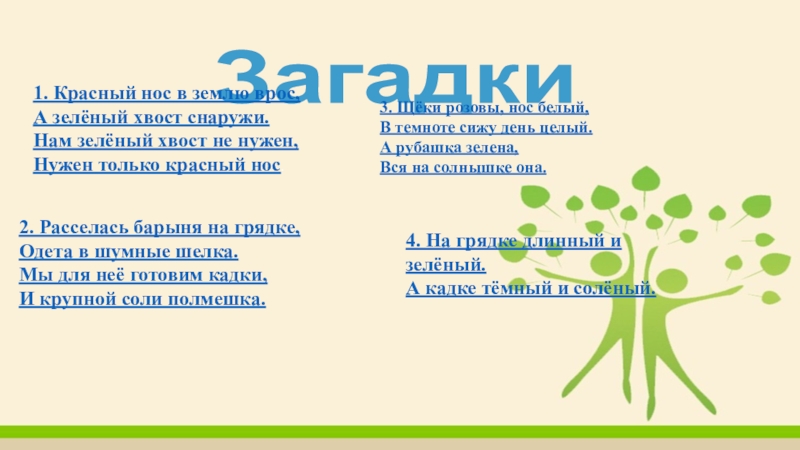 3. Щёки розовы, нос белый, В темноте сижу день целый. А рубашка зелена, Вся на солнышке она.