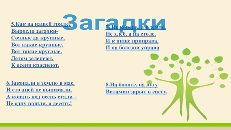 6.Закопали в землю в мае. И сто дней не вынимали, А копать под осень стали – Не одну нашли, а десять!