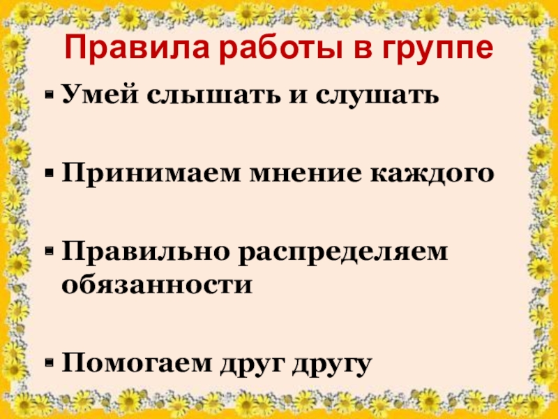 Правила работы в группеУмей слышать и слушатьПринимаем мнение каждогоПравильно распределяем обязанностиПомогаем друг другу