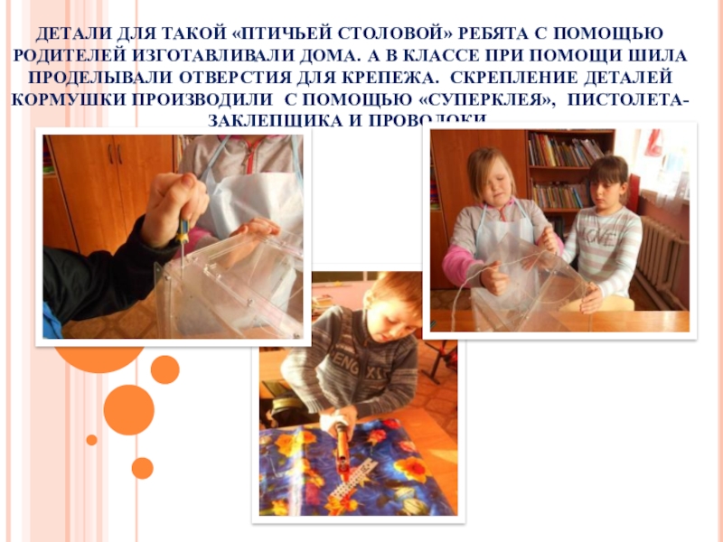 А В КЛАССЕ ПРИ ПОМОЩИ ШИЛА ПРОДЕЛЫВАЛИ ОТВЕРСТИЯ ДЛЯ КРЕПЕЖА. СКРЕПЛЕНИЕ ДЕТАЛЕЙ КОРМУШКИ ПРОИЗВОДИЛИ С ПОМОЩЬЮ «СУПЕРКЛЕЯ», ПИСТОЛЕТА-ЗАКЛЕПЩИКА И ПРОВОЛОКИ.