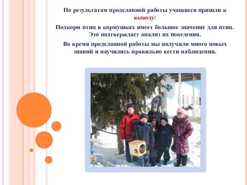 Но зима - трудное время для птиц. Больше всего зимой они гибнут не от холода, а от голода. Если мы поможем им в это время, весной и летом они отблагодарят нас заботой о растениях, своим видом и звонким пением подарят нам радость и хорошее настроение. Учащиеся школы считают своим долгом помочь птицам пережить суровое зимнее время, не дать им погибнуть. Зимняя подкормка птиц - один из важнейших способов их сохранения. Для этого учащиеся изготавливали кормушки, вывешивали их и проводили регулярную подкормку птиц.