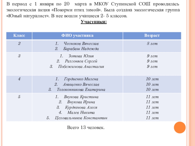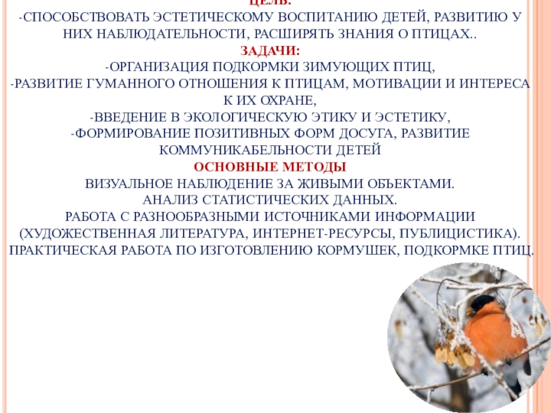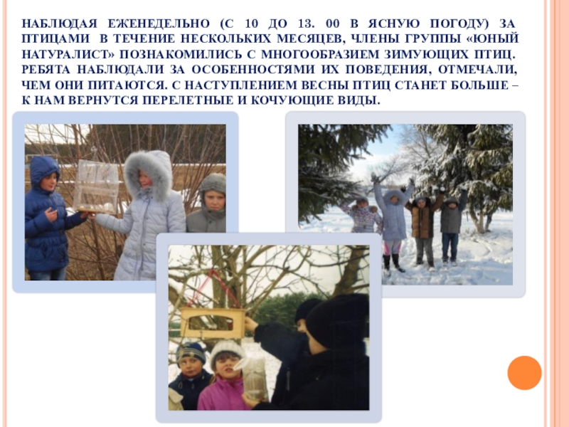 ПТИЦАМИ В ТЕЧЕНИЕ НЕСКОЛЬКИХ МЕСЯЦЕВ, ЧЛЕНЫ ГРУППЫ «ЮНЫЙ НАТУРАЛИСТ» ПОЗНАКОМИЛИСЬ С МНОГООБРАЗИЕМ ЗИМУЮЩИХ ПТИЦ. РЕБЯТА НАБЛЮДАЛИ ЗА ОСОБЕННОСТЯМИ ИХ ПОВЕДЕНИЯ, ОТМЕЧАЛИ, ЧЕМ ОНИ ПИТАЮТСЯ. С НАСТУПЛЕНИЕМ ВЕСНЫ ПТИЦ СТАНЕТ БОЛЬШЕ – К НАМ ВЕРНУТСЯ ПЕРЕЛЕТНЫЕ И КОЧУЮЩИЕ ВИДЫ.