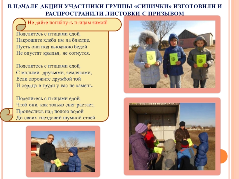 Слайд 6В НАЧАЛЕ АКЦИИ УЧАСТНИКИ ГРУППЫ «СИНИЧКИ» ИЗГОТОВИЛИ И РАСПРОСТРАНИЛИ ЛИСТОВКИ С