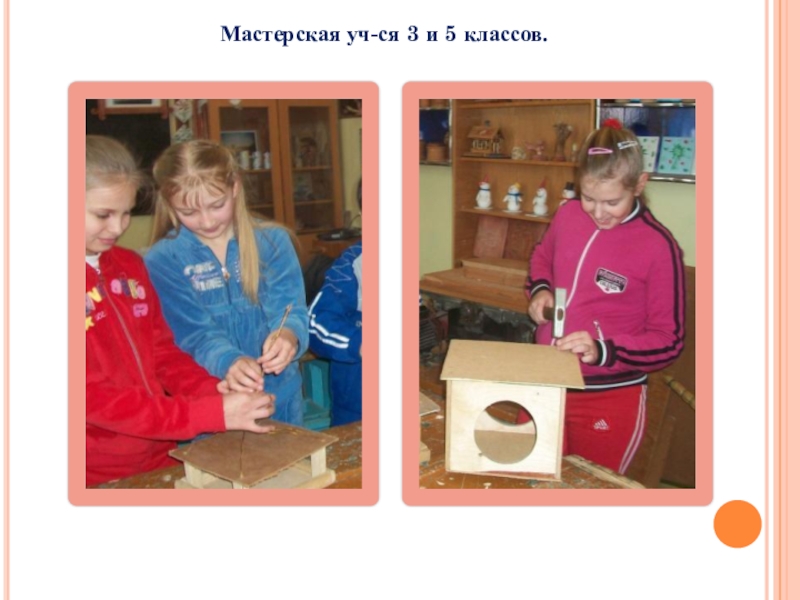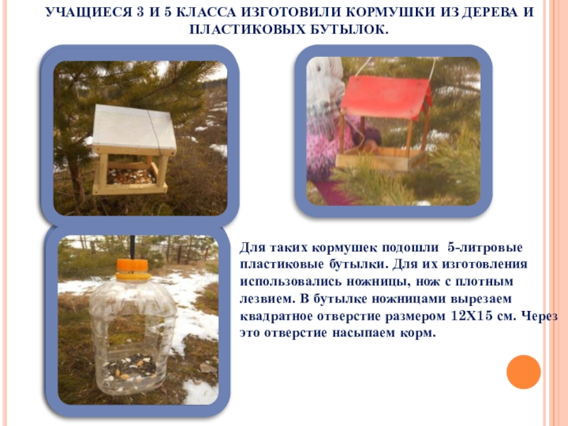 Слайд 12УЧАЩИЕСЯ 3 И 5 КЛАССА ИЗГОТОВИЛИ КОРМУШКИ ИЗ ДЕРЕВА И ПЛАСТИКОВЫХ