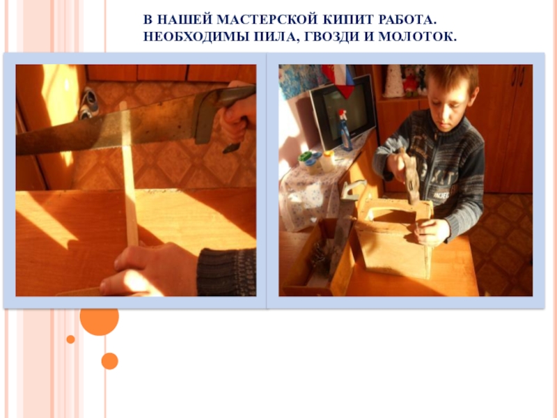 Слайд 11В НАШЕЙ МАСТЕРСКОЙ КИПИТ РАБОТА. НЕОБХОДИМЫ ПИЛА, ГВОЗДИ И МОЛОТОК.