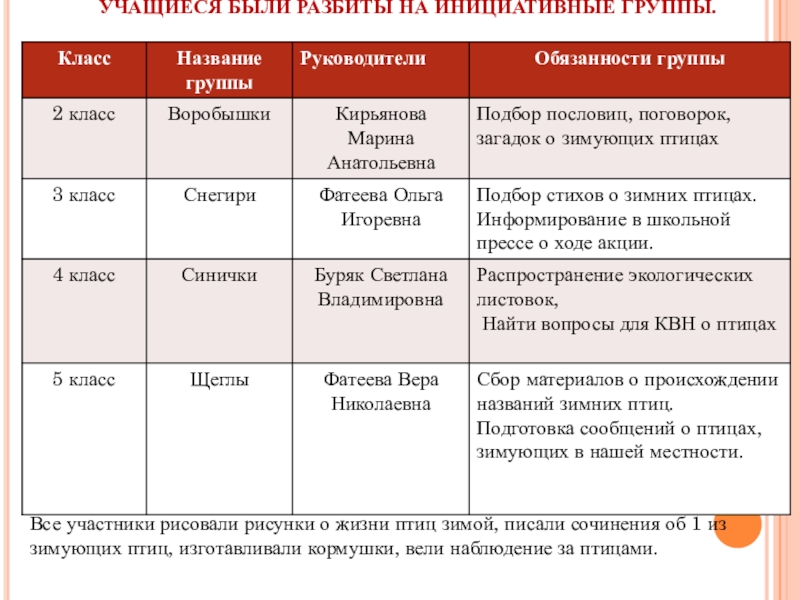 птиц зимой, писали сочинения об 1 из зимующих птиц, изготавливали кормушки, вели наблюдение за птицами.