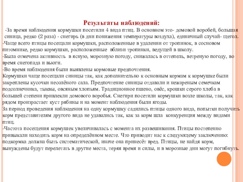-Частота посещения кормушек увеличивалась с момента их развешивания. Птицы постепенно привыкали находить корм на определённом месте. Что приводит нас к следующему заключению: подкормка должна быть систематической, иначе она принесёт вред. Птицы, не найдя корм, вынуждены будут перелетать в другие места, теряя время и силы, и в морозные дни могут погибнуть.