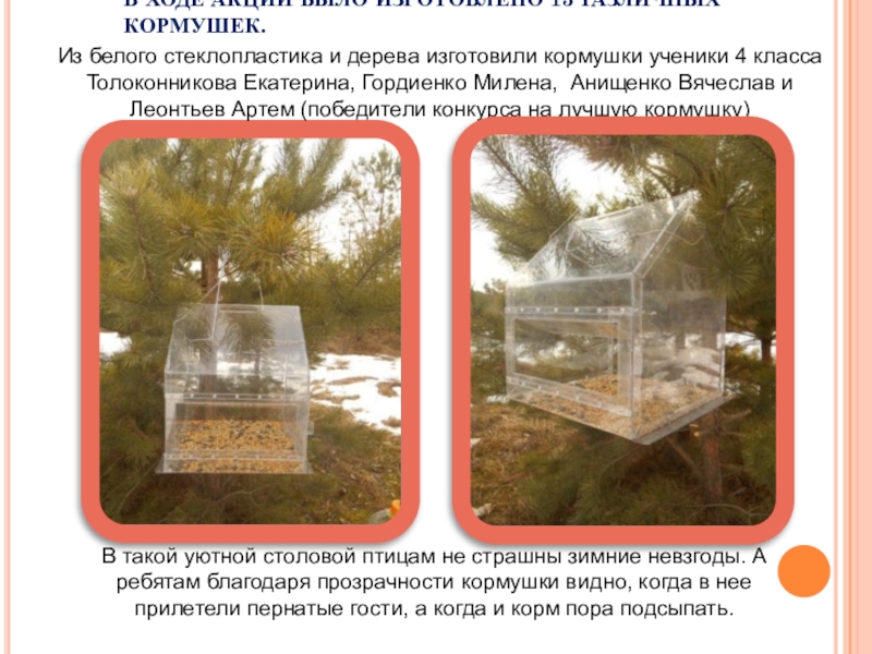 Из белого стеклопластика и дерева изготовили кормушки ученики 4 класса Толоконникова Екатерина, Гордиенко Милена, Анищенко Вячеслав и Леонтьев Артем (победители конкурса на лучшую кормушку)