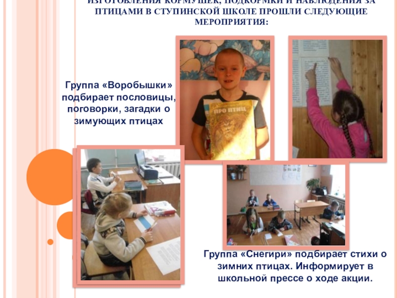 Группа «Снегири» подбирает стихи о зимних птицах. Информирует в школьной прессе о ходе акции.