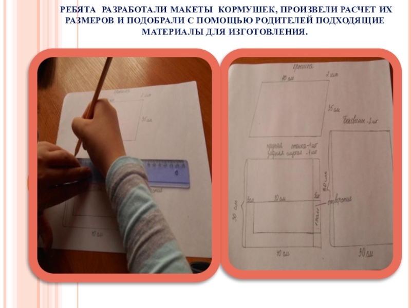 Слайд 8РЕБЯТА РАЗРАБОТАЛИ МАКЕТЫ КОРМУШЕК, ПРОИЗВЕЛИ РАСЧЕТ ИХ РАЗМЕРОВ И ПОДОБРАЛИ С