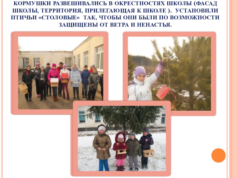 Слайд 14КОРМУШКИ РАЗВЕШИВАЛИСЬ В ОКРЕСТНОСТЯХ ШКОЛЫ (ФАСАД ШКОЛЫ, ТЕРРИТОРИЯ, ПРИЛЕГАЮЩАЯ К ШКОЛЕ