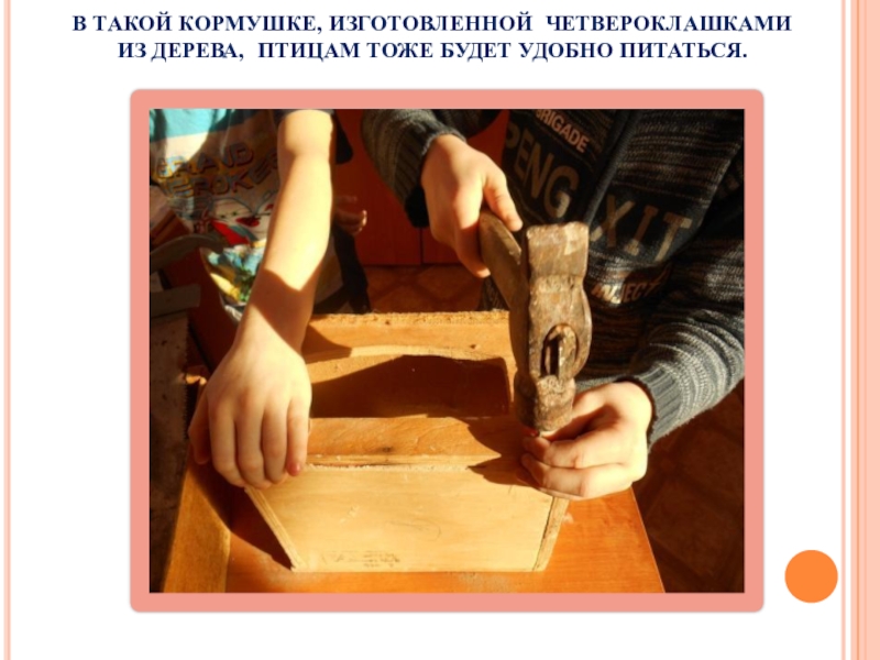 Слайд 10В ТАКОЙ КОРМУШКЕ, ИЗГОТОВЛЕННОЙ ЧЕТВЕРОКЛАШКАМИ ИЗ ДЕРЕВА, ПТИЦАМ ТОЖЕ БУДЕТ УДОБНО