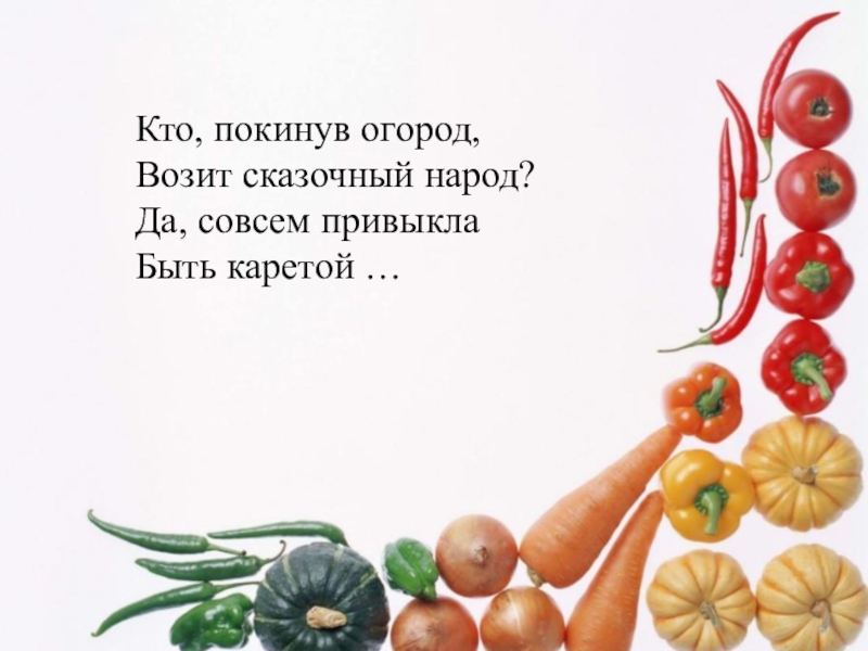 Слайд 5Кто, покинув огород, Возит сказочный народ? Да, совсем привыкла Быть каретой …