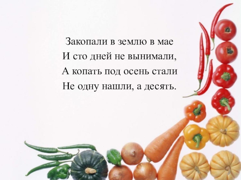 Закопали в землю в маеИ сто дней не вынимали,А копать под осень сталиНе одну нашли, а десять.