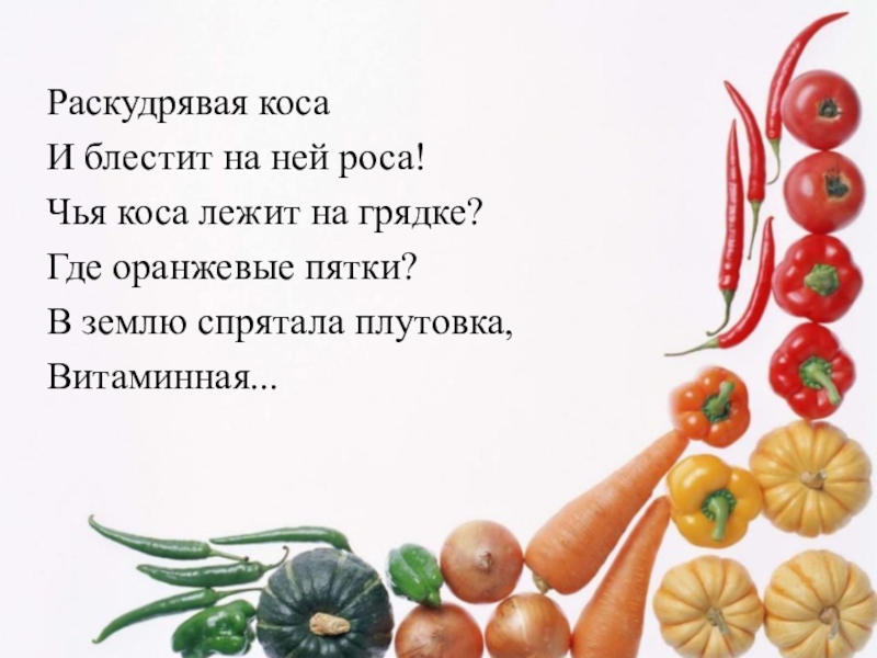 Раскудрявая косаИ блестит на ней роса!Чья коса лежит на грядке?Где оранжевые пятки?В землю спрятала плутовка,Витаминная...