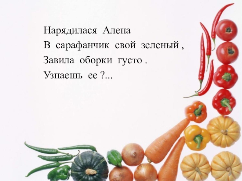 Нарядилася АленаВ сарафанчик свой зеленый ,Завила оборки густо .Узнаешь ее ?...