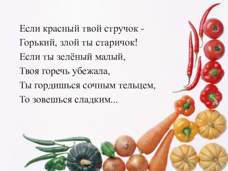 Если красный твой стручок -Горький, злой ты старичок!Если ты зелёный малый,Твоя горечь убежала,Ты гордишься сочным тельцем,То зовешься