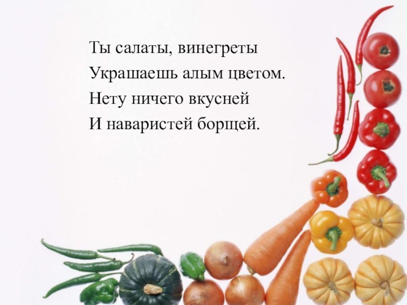 Ты салаты, винегретыУкрашаешь алым цветом.Нету ничего вкуснейИ наваристей борщей.
