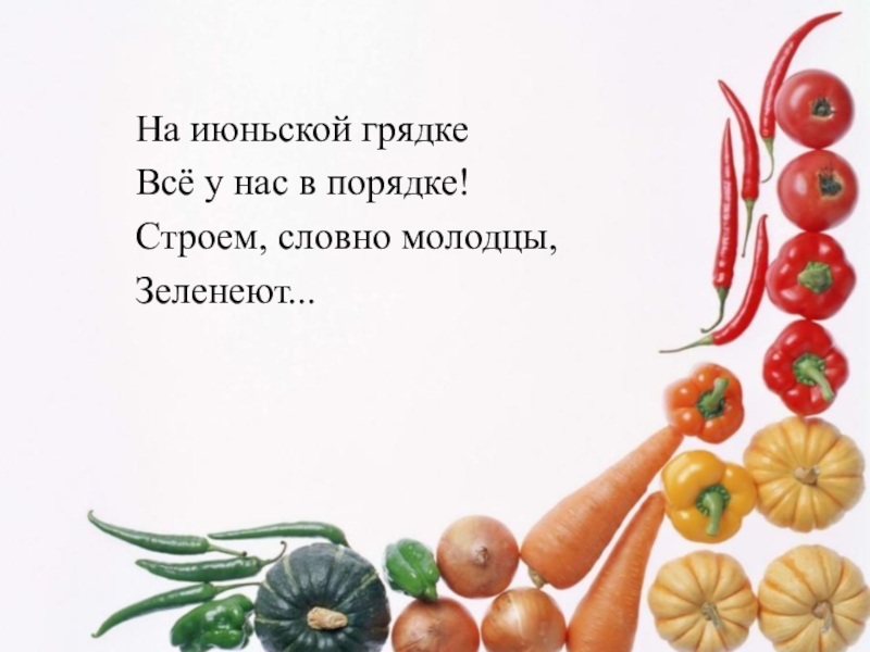 На июньской грядкеВсё у нас в порядке!Строем, словно молодцы,Зеленеют...